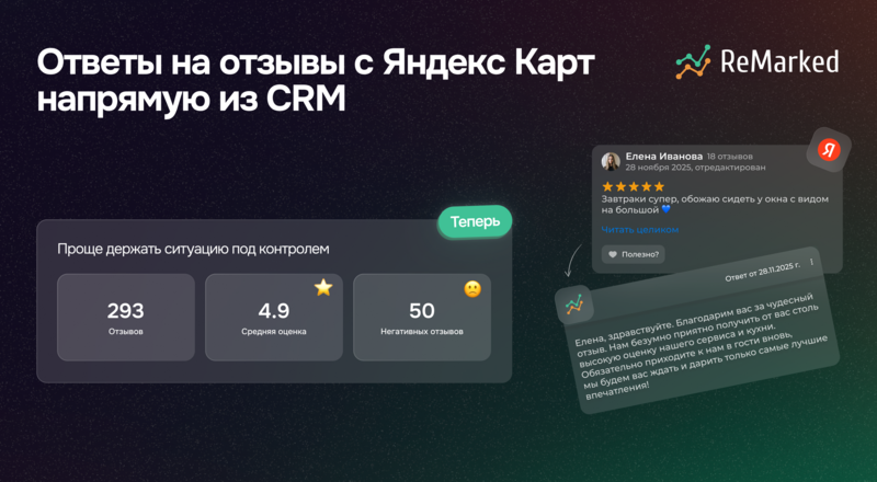 Теперь отзывы с Яндекс Карт можно обрабатывать напрямую из CRM — отвечать, редактировать ответ или удалять его не переходя на площадку.