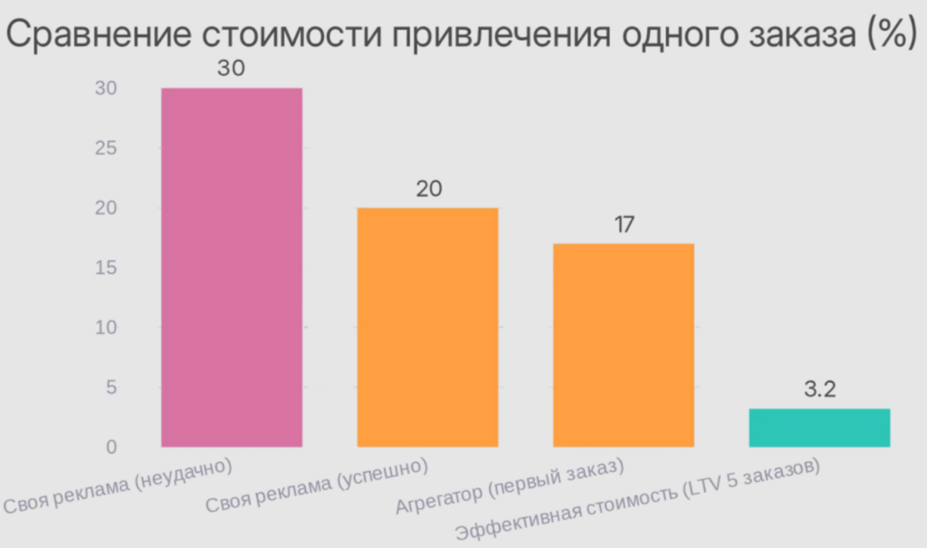 Ключевое слово — «на первый взгляд». Если гость, пришедший от агрегатора, бронирует стол у вас еще четыре раза, но уже напрямую через вашу систему, экономика кардинально меняется. Первоначальные 170 рублей затрат распределяются на все пять визитов.