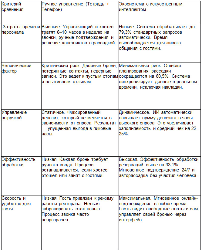 Экономика 5 минут: Сокращение времени оборота стола (простоя между гостями) всего на 5–7 минут в пиковые часы позволяет добавить +1 дополнительную посадку на этот стол за вечер. Это прямая конвертация технологии в деньги.